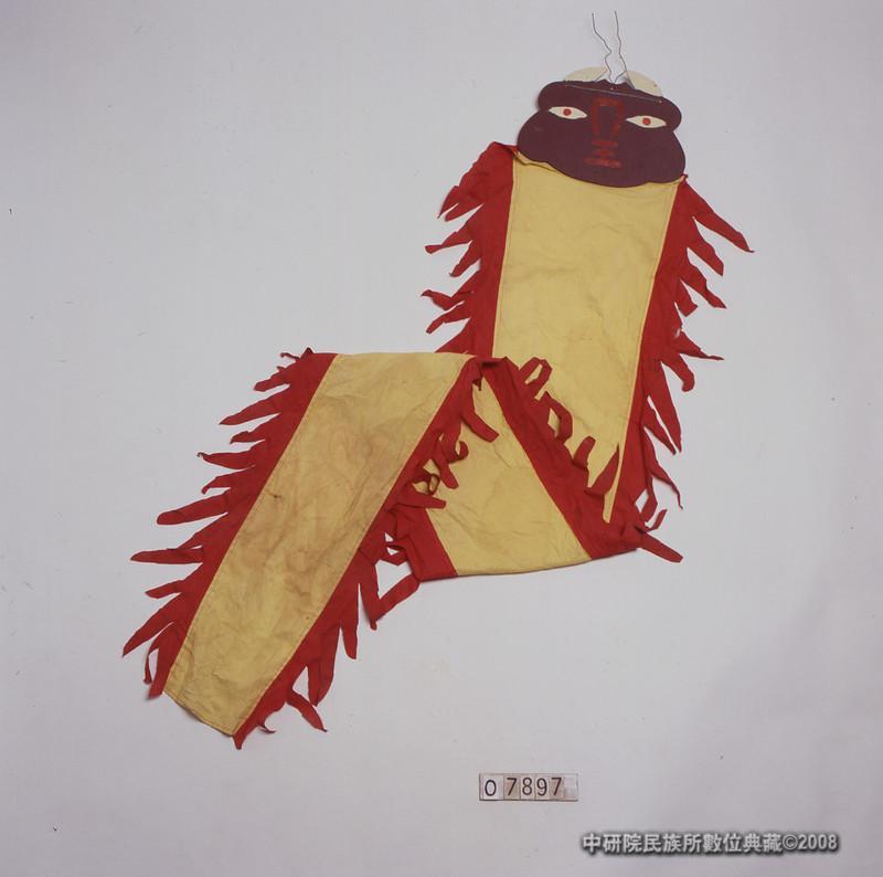 及頭上雙角,身體為黃長布條,兩側縫飾三角鬚狀之紅細布條,頂端有鐵絲纏繞供懸掛。 測量:頭部:22.0cm*30.0cm*0.5cm 總長205.0cm
